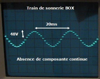 Ringing, the signals have good temporal characteristics (ringing of 50Hz for a duration of 1.4 s 3.6 s apart) but the voltage levels are very different: there is no DC component and AC component to an amplitude of 48 V (half the standard 96V). In addition the sinusoid is not well smoothed, one can clearly distinguish the eye of the stairs. In fact the sine wave is generated via a digital - analog of a sampling frequency of 1kHz, and probably a resolution equal to 16 bits.